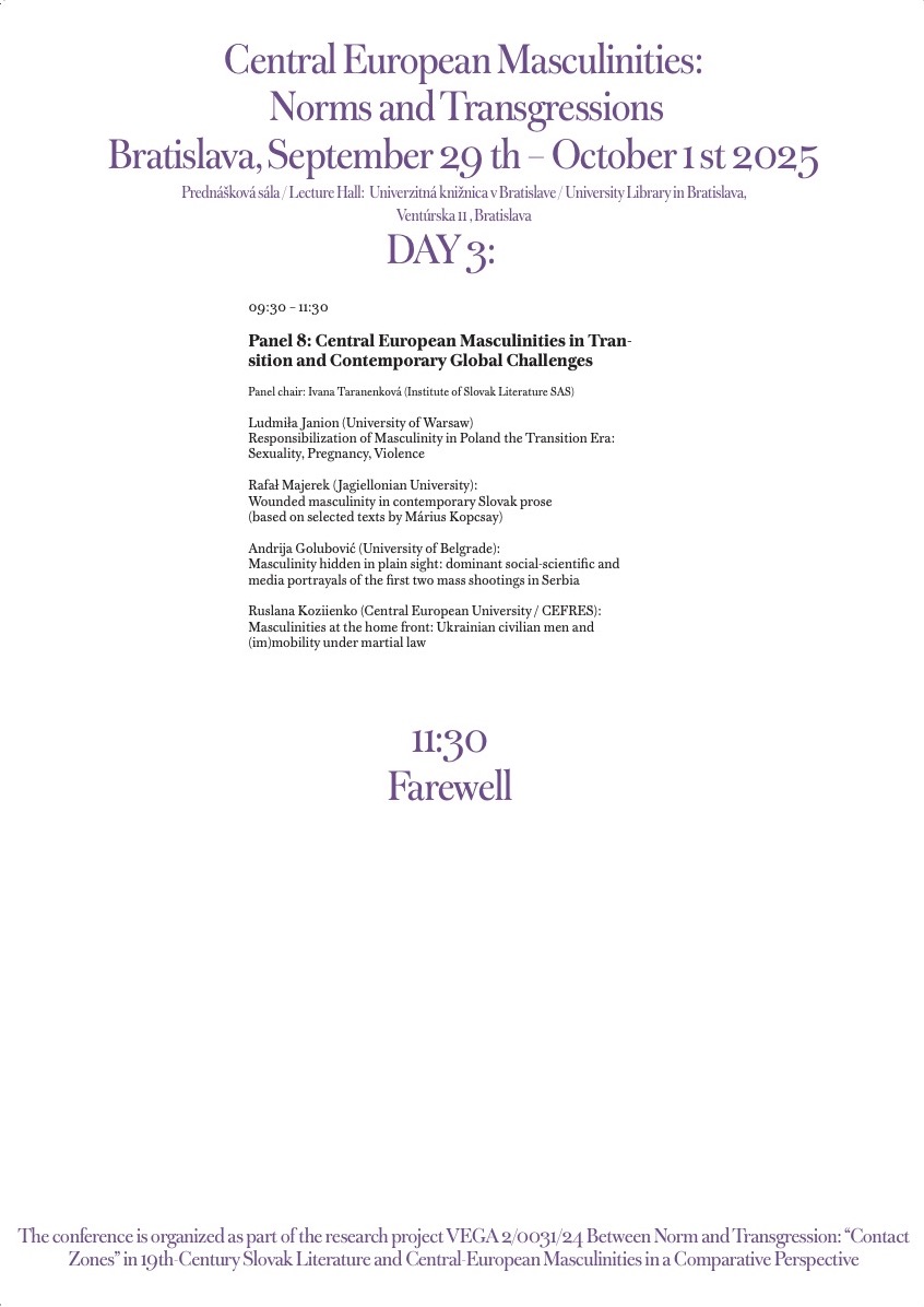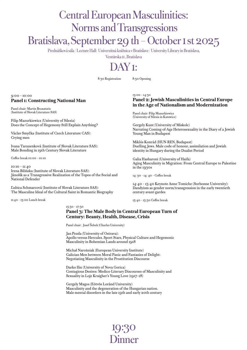 International conference Central European Masculinities. Norms and TransgressionsΒ will take place from September 29 to October 1, 2025, in the Lecture Hall of the University Library in Bratislava at VentΓΊrska 11. It will be held in English and is open to the public.