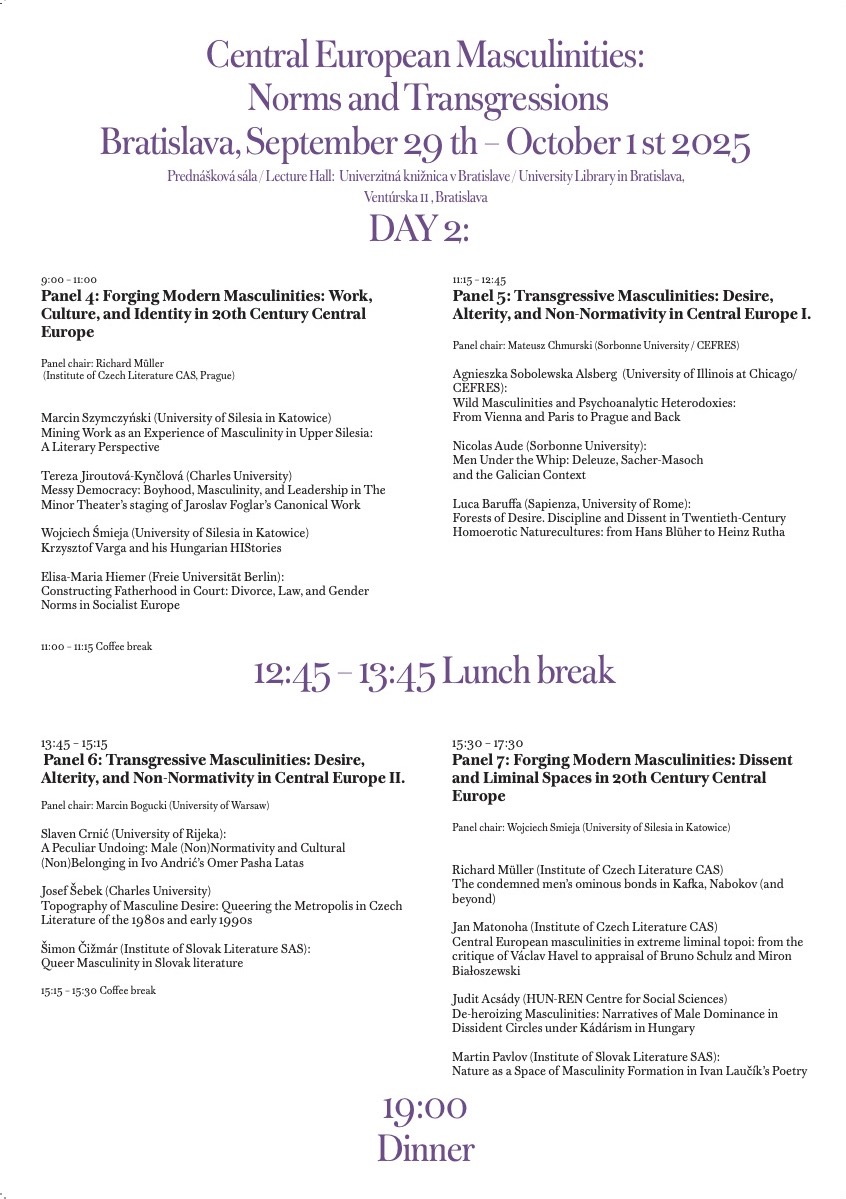Distinguished guests from academic institutions in Chicago, Rome, Haifa, Paris, Krakow, Berlin, Warsaw, Budapest, Belgrade, Rijeka, Prague, Katowice, Ostrava and Bratislava will present their contributions. The research project Central European Masculinities is a collaboration between the Institute of Literary Studies at the University of Silesia in Katowice, the Institute of Czech Literature and Comparative Literature at the Faculty of Arts of Charles University, the Institute for Czech Literature at the Czech Academy of Sciences, the Institute of Polish Culture at the University of Warsaw, the Center for Social Sciences in Budapest (HUN-REN-ELTE), the French Research Center for Humanities and Social Sciences in Prague (CEFRES, CNRS-MEAE), which is supported by the French Ministry of Higher Education and Research through the PARCECO program, and finally the Institute of Slovak Literature of the Slovak Academy of Sciences. It is held with the kind support of the University Library in Bratislava.